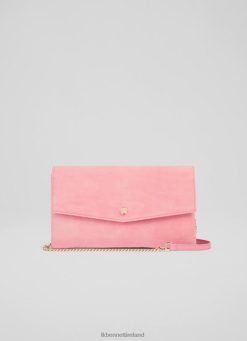 Designed to team up with our Ivy sandals, the Mason bag is pretty in (bright) pink. Crafted in Spain from lustrous satin, it’s an envelope style with a press stud fastening decorated with a sparkling crystal button. It has a removable chain and leather shoulder strap, and inside it has a zip pocket. Wear it with the matching shoes or simply to bring a pop of colour to neutral looks.